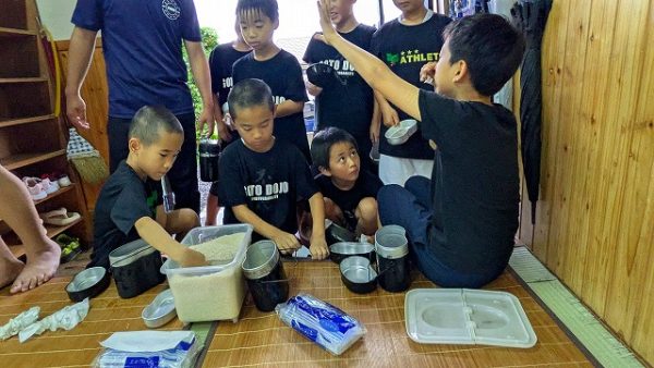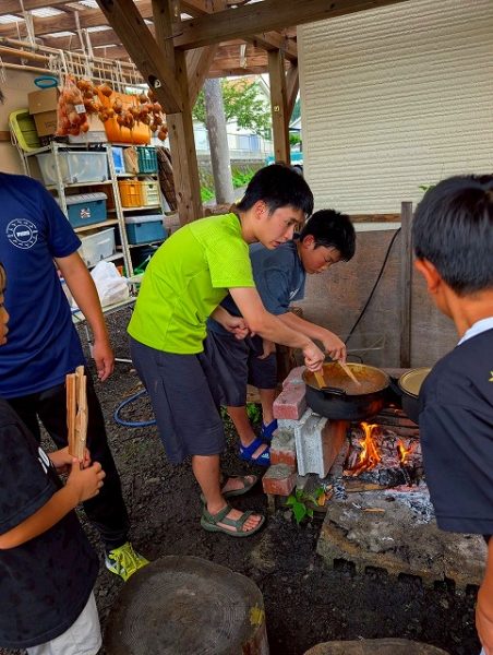 作ったことのある子どもたちがお米洗おう!火をつけなきゃ!薪わりしなきゃ!とあれこれ声掛けしあってすばらしい連携!