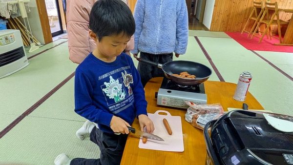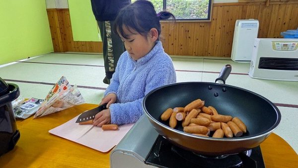 まずはみんなで昼食つくりをしてもらいました。ウィンナーやたまごやき、おにぎりつくり。